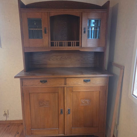 Spegelsskänk/skåp i massiv ek m fanér fr 1900-talets första hälft. Låsbara lådor, nyckel finns. Visst slitage på ovansidan av nedre skåpdelen, i övrigt fint skick.