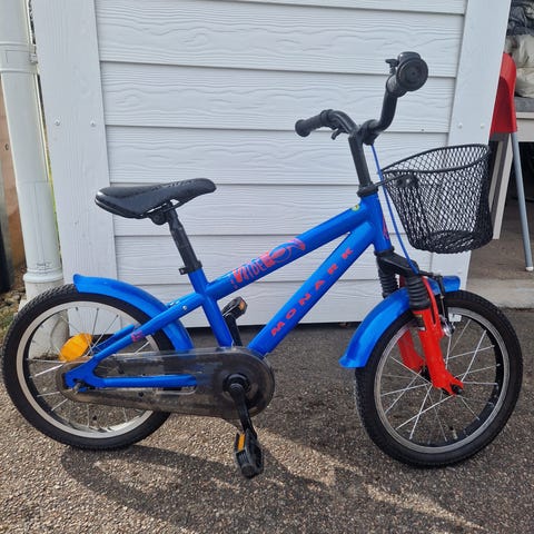 Monark barncykel med 16" hjul i rosa färg. Cykeln har låg ram för enklare på- och avstigning, korg framtill samt pakethållare bak. Utrustad med stöd, kedjeskydd och bruna handtag och sadel. Passar barn som behöver en mindre cykel med 16-tums hjul för vardagscykling.