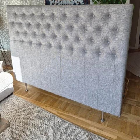Mio sänggavel, vadderat klädd i tyg och med knappar.
