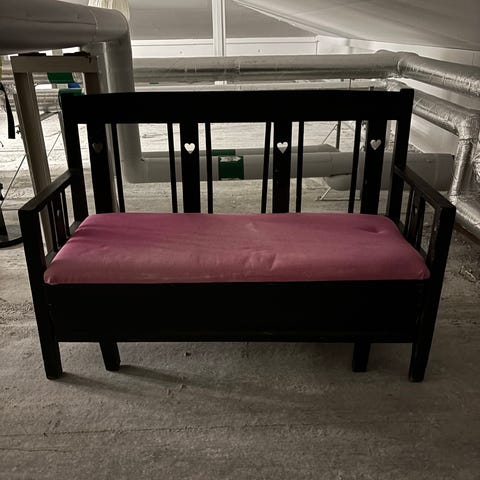 Fin äldre träsoffa med förvaring under sitsen.