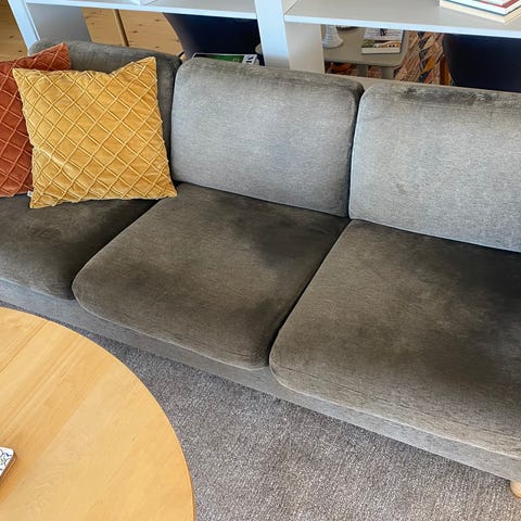 Soffa i 3-sitsmodell i mörkgrått tyg. Rak, modern form med breda armstöd och två sittdynor samt två ryggdynor. Passar som huvudsoffa i vardagsrum eller som extra sittplats i större rum. Neutralt färgsatt vilket gör den lätt att kombinera med olika inredningsstilar. Satt lågt pris för det känns bra att den kommer till användning.