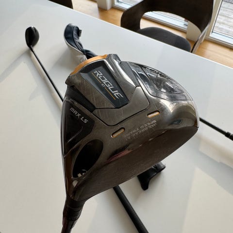 Cobra F-Max driver i svart utförande. Klubban har ett voluminöst klubbhuvud med bred träffyta och mörk, blank ovansida. Skaftet är lättviktsskaft med tryckt modellinformation och standardgrepp i svart gummi med strukturmönster. Passar för golfspelare som söker en driver för utslag från tee på golfbanan.