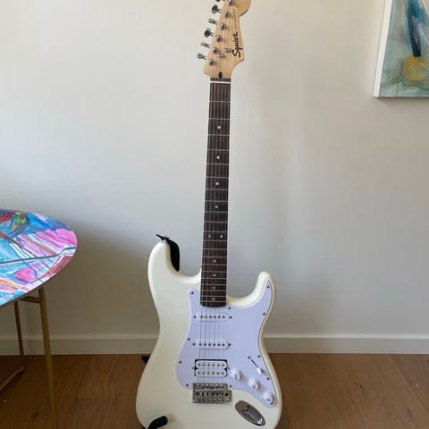 Squier Stratocaster elgitarr i vit färg. Klassisk Stratocaster-kropp med tre mikrofoner i HSS-konfiguration (humbucker vid stall och två single-coils).