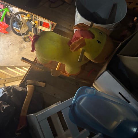 Mysig gunghäst utformat som en mammut i grå, långhårig plysch med trämedar och trähandtag. Passar som leksak och inredningsdetalj i barnrum.