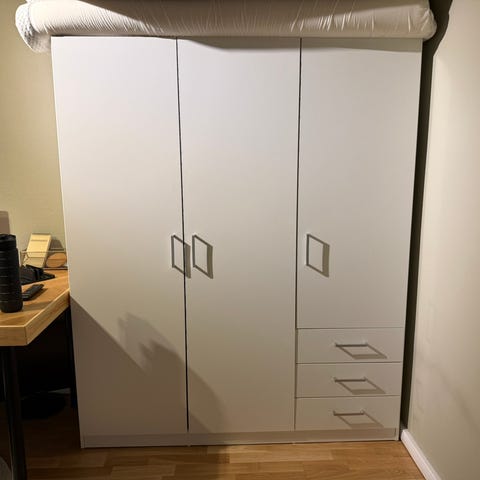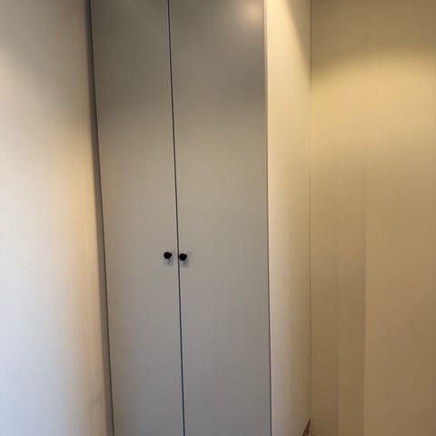 Garderob med hyllor.