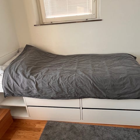 Vit IKEA säng ”Släkt” med måtten 90*200 cm. Skummadrass ”Åbygda” och madrasskydd ”Rosenvial” ingår. Förvaring under sängen i form av fyra utdragbara lådor för t.ex. leksaker/kläder samt två hyllor som är toppen till att förvara t.ex. böcker/spel. Nypris för säng, madrass och madrasskydd totalt 5,800 kr.