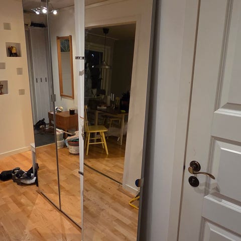 Skjutdörrsparti bredd 2m höjd 2,12m i spegelglas/aluminium i mycket gott skick.