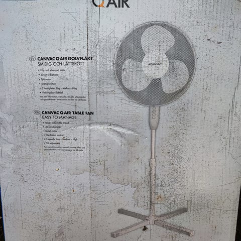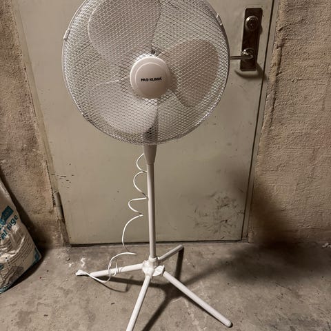 Golvvärmefläkt i vit färg. Fläkten står på stativ med kryssfot och har rund skyddskorg med tre rotorblad. Höjden är justerbar och fläkten är avsedd för inomhusbruk, exempelvis i hem, kontor eller förråd för att cirkulera luft och ge svalka.