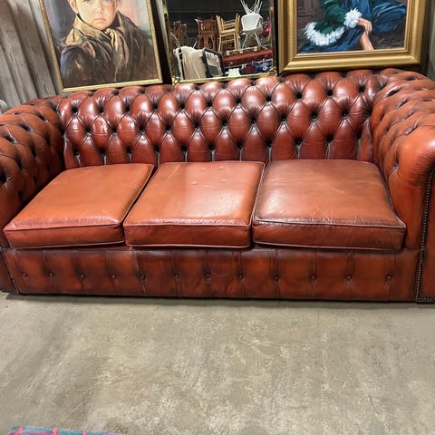Klassisk Chesterfield-soffa i äkta läder med tillhörande wingback-fåtölj