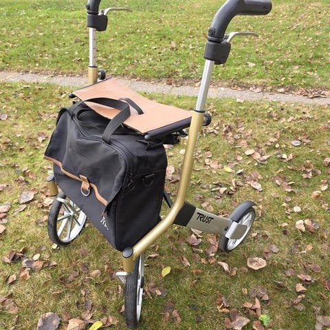 Trust rollator med sits och korg. Rollatorn har tre hjul, metallram och trädetaljer på benen. Handtaget är klätt i ljust material för bättre grepp. Utrustad med en mindre tygkorg framtill för förvaring av personliga tillhörigheter. Sitsen är rund och placerad ovanför korgen. Passar för inomhus- och lättare utomhusbruk där extra stöd vid gång behövs.