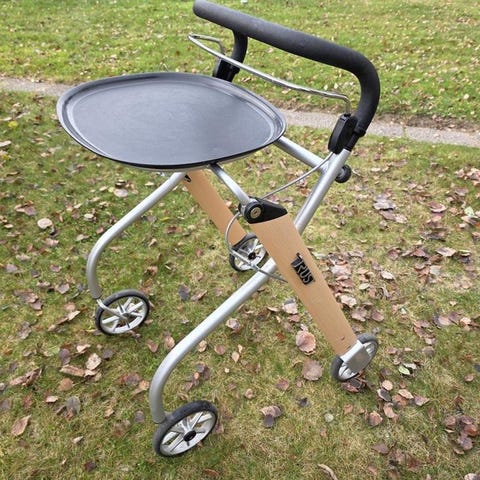 Trust rollator med sits och korg trädetaljer