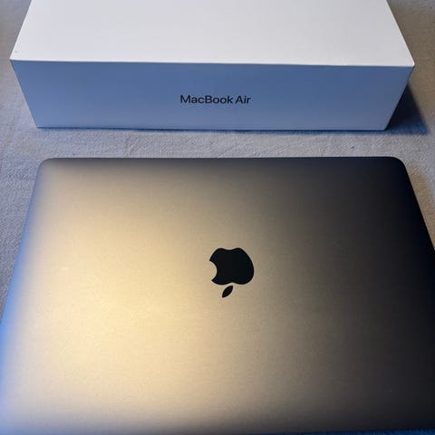 Apple MacBook Air laptop i silverfärg. Tunn och lätt modell med inbyggt tangentbord, styrplatta och skärm med inbyggd kamera. Aluminiumchassi och svartvit tangentlayout. Lämplig för vardagsanvändning som webbsurf, kontorsarbete och studier. Exakta tekniska specifikationer som skärmstorlek, lagring och processor framgår inte av uppgifterna och kan kontrolleras i systeminställningarna.
