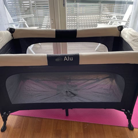Svart Brio resesäng, fungerar utmärkt. Blixtlås till gavel luckan trasigt.