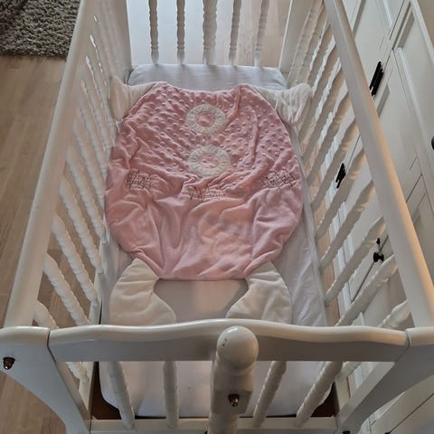IKEA vagga i vit färg. Vaggans sidor består av spjälor och gavlarna är hela. Vaggan står på medar som gör att den kan gungas fram och tillbaka. Madrass ingår enligt bild. En mindre skada/ett märke syns på ena gaveln, se närbild. Passar som sovplats för spädbarn under de första månaderna.