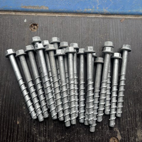 Byggbeslag vinkelbeslag och plattjärn i galvaniserat stål. Blandade beslag med förborrade hål för skruv eller bult, lämpliga för trä- och konstruktionsarbeten. En etikett visar dimension 105 x 192 x 90 mm på en typ av beslag. Säljes som parti med flera olika storlekar och utföranden enligt bilderna.