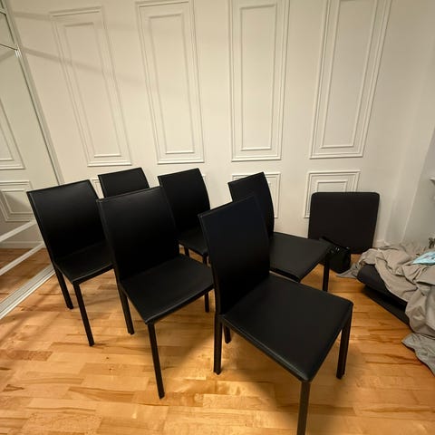 Fyra egentligen mycket fina stolar, som var dyra i inköp och fortfarande är mycket stabila och bra rent strukturellt, behöver en ny chans. Du som kan klä om möbler, och vill rädda dessa fyra stolar har ett fynd framför dig. Jag skulle gjort jobbet själv och behållit dem om jag haft den kunskapen. I dagsläget är de klädda med fuskläder, som spruckit, och till och med ramlat av något eller några av stolsbenen. Men de är mycket sköna att sitta på, och har potential att bli snygga igen.