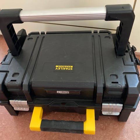 Stanley verktygsväska i svart och gult tyg. Utvändigt är det tre fack på vardera bak - framsida, där en framficka är sluten med lock för säker förvaring av smådelar eller personliga tillhörigheter.