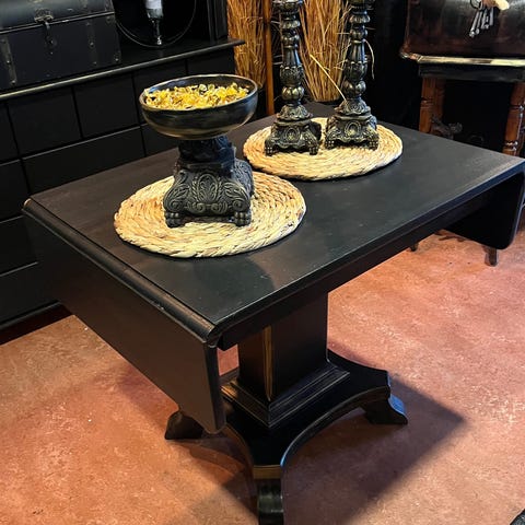 Fantastiskt klaffbord med mängder av patina. 74 x 74 eller 52 x 52 cm. Höjd 74 cm.