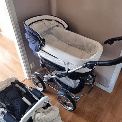 Britax barnvagn med både liggdel och sittdel. Vagnen består av sittdel och separat liggdel som kan fästas på chassit. Passar för spädbarn i liggdelen och större barn i sittdelen. Klädseln är i textil och kan tvättas. Vagnen har hjul anpassade för vardagsbruk. Djur- och rökfritt hem. Välanvänd men funkar som den ska.