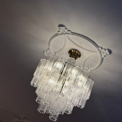 Kronan består av flera nivåer av glasprismor monterade i metallstomme – en ikonisk italiensk design som var populär under 1960–70-talet.