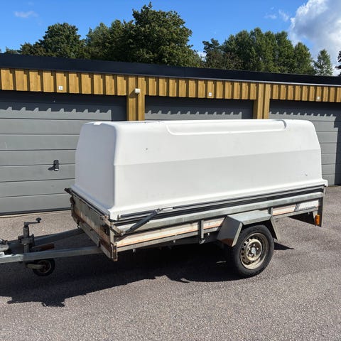 Fogelsta släpvagn med vit kåpa. Släpet har tippbart flak med kåpa i hårdplast och dragkrok framtill. Bak finns öppningsbar baklucka och bakljus. Passar för transport av exempelvis gods, utrustning eller trädgårdsavfall. Registreringsskylt och belysning är monterade baktill på släpvagnen.