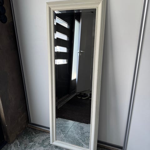 Jysk spegel med vit ram. Rektangulär helkroppsspegel som kan lutas mot vägg eller hängas upp beroende på upphängning. Passar i till exempel hall, sovrum eller vardagsrum för helkroppsreflektion och som inredningsdetalj.