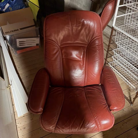 Fåtölj i äkta läder . Fåtöljen har en snurrfunktion och en justerbar ryggstöd.
