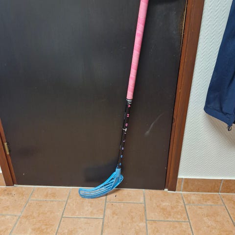 Set med två innebandyklubbor. En längre klubba med rött plastblad och lindat grepp samt en kortare klubba med grönt plastblad och svart skaft. Passar för lek eller enklare innebandyspel inomhus. Material huvudsakligen plast.