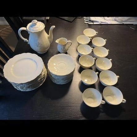 Thun porslinservis i vit färg med blå dekor. Servisen består av tallrikar, djupa tallrikar, koppar med fat, kaffekanna, gräddkanna och sockerskål enligt bilder. Passar för servering av kaffe, te och måltider. Klassisk design i glaserat porslin med dekormönster längs kanterna. Märkt Thun, Carlsbad, Czech Republic på undersidan av delarna.