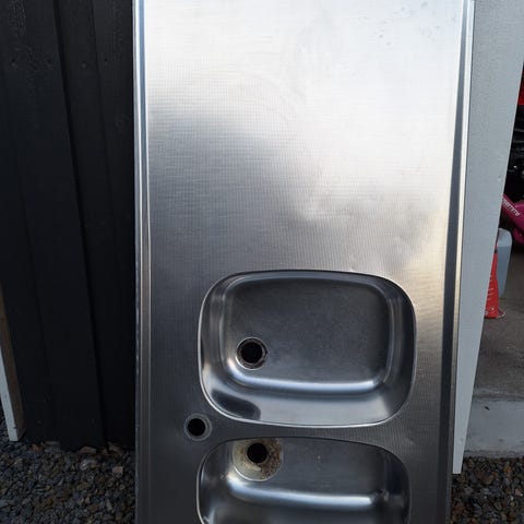 Hillesjön diskho i rostfritt stål från IKEA med en och halv ho med hål för blandare. Avloppsrör och anslutningar ingår. Mer information på https://applink.ikea.com/tY8M9r9M4w--49140631--se--sv