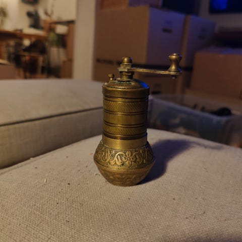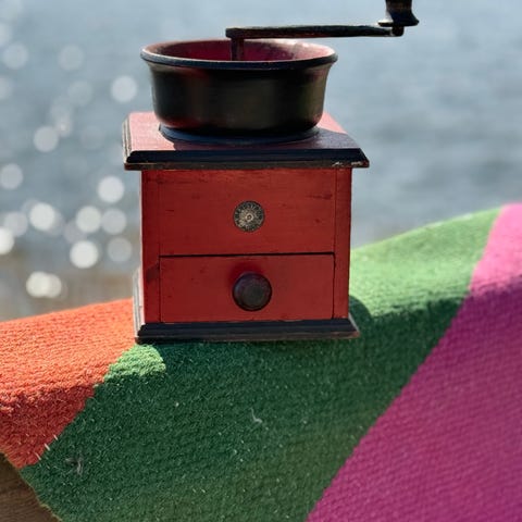 Kvarnen har en vev upptill, malverk i metall och en behållare för kaffebönor.