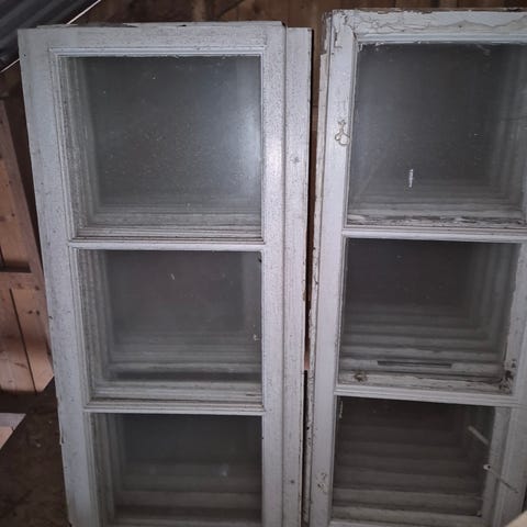 Kärnfriska träfönster med karm i tvåluftsutförande. Behov av skrapning, målning, kittning. Några glas är ev spruckna.