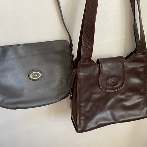 Röd axelremsväska, använd och något sliten men inga skador och repor, stl ca 20x20 cm, 75 kr.