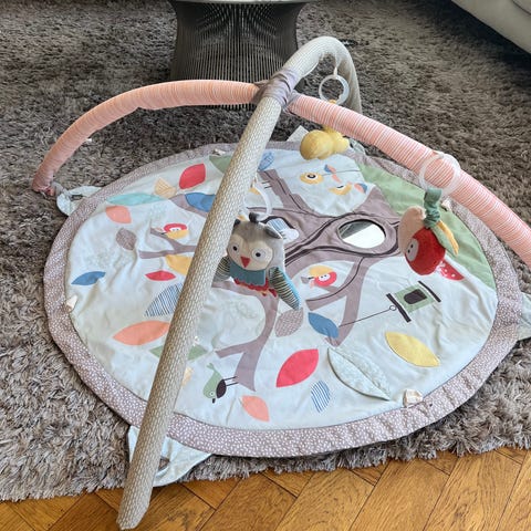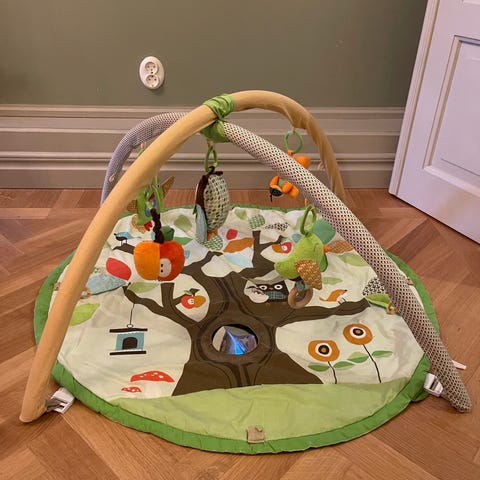 Babygym Skip Hop Treetop Friends Classic i fina milda färger med djurmotiv. Fem figurer som kan sättas på olika höjder, matchande kudde och babyspegel medföljer. Mjuk tvättbar matta. Roliga aktiviteter med ljud, former och färger som uppskattades mycket av vårt pyre. Fint skick och alla aktiviteter fungerar fortfarande som de ska. Transportväska medföljer.