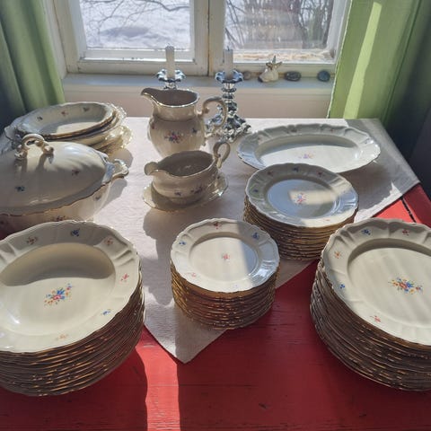 Äldre servis med dekorativ guldkant och små blommor. Klassisk och tidlös modell.