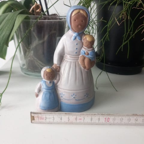 Porslinsfigurerna är glaserade i ljusa pastellfärger som beige, grått, vitt och lila. Motiven inkluderar bland annat en pojke med håv vid ett träd, en flicka vid en brunn, en sittande flicka med fågel samt en sittande flicka med blommor i handen.