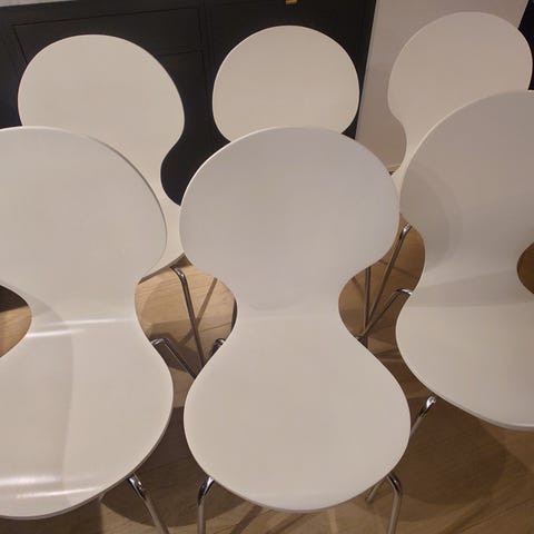 Snygga köksstolar i vitt med kromade ben. Skulle gissa Mio. Finns 6st. 100kr/ st.