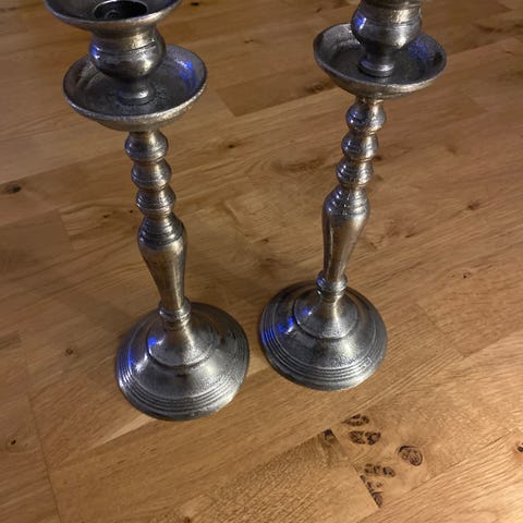 Ljusstakar i tenn. Set om två ljusstakar i metall med klassisk form och rund fot. Passar för vanliga kronljus och kan användas som bordsdekoration eller inredningsdetalj i hemmet. Märkningar finns på undersidan av ljushållaren.Hämtas