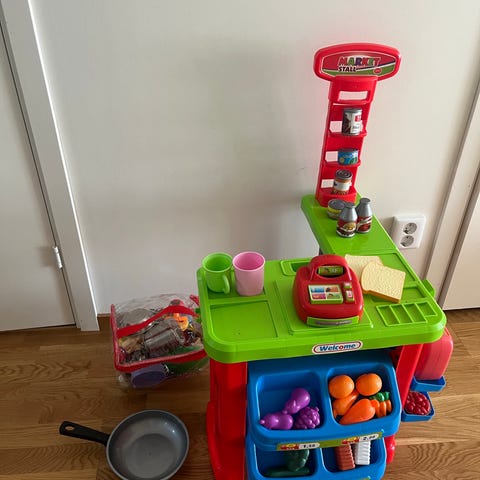Leksakskassaapparat med en våg, en handscanner och en kortläsare. Inkluderar leksaksmat som korv, banan, bröd, pasta och chokladmjölk. Levereras med leksakspengar i form av sedlar och mynt samt VIP-kort.