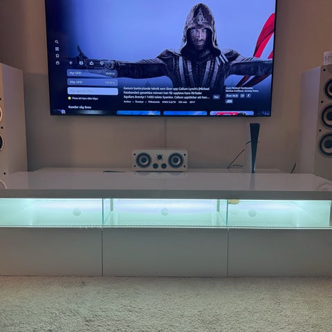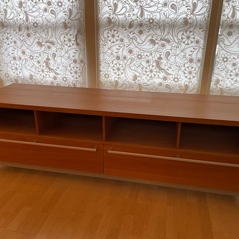IKEA tv-bänk med öppna fack och lådor träfaner