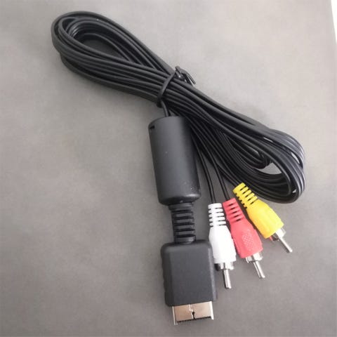 Xbox AV-kabel med SCART-kontakt i ena änden och tre kompositkontakter (gul video, röd och vit ljud) i andra änden. Kabeln är avsedd för anslutning av Xbox-konsol till TV eller annan bildskärm med SCART- eller kompositingång. Svart kabel med integrerad Xbox-kontakt mot konsolen och färgkodade RCA-kontakter för enkel inkoppling av video och stereoljud.