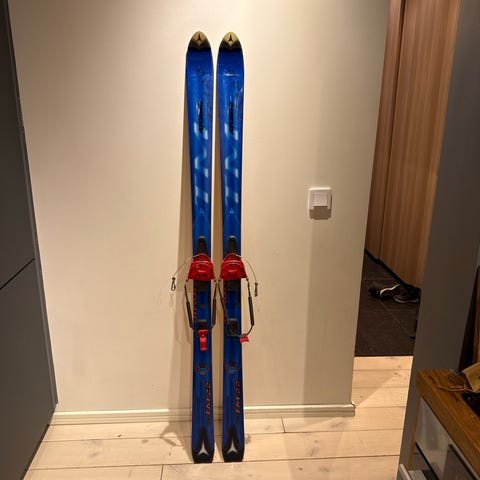 170cm med Diamir-bindningar. Skidorna har en röd och gul färgövergång med grafiskt mönster. Bindningarna Fritschi Diami