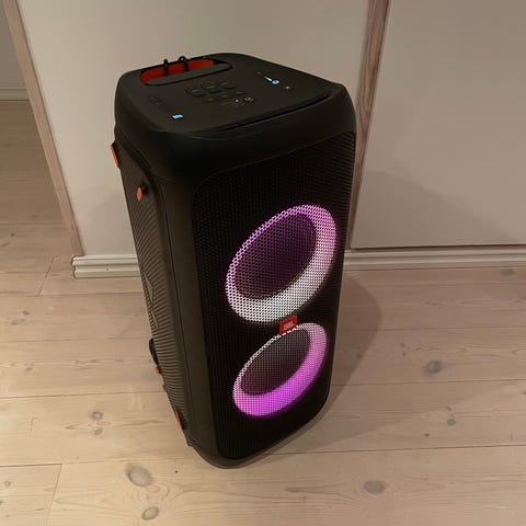 JBL PartyBox 310, bärbar högtalare i svart med inbyggda LED‑ljuseffekter runt fronhögtalarna. Högtalaren har kontrollpanel på ovansidan med knappar för volym, uppspelning, ljusinställningar och anslutningar. Bärhandtag gör den enkel att flytta mellan olika rum eller ta med till sammankomster. Lämplig för musikuppspelning inomhus och vid mindre evenemang där kraftigare ljud och ljuseffekter önskas.
