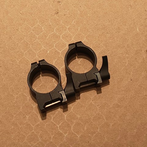 Ett par kikarsiktesringar i svart utförande. Ringarna är avsedda för montering av kikarsikte på vapen med passande bas. Materialet är metall med skruvfästen upptill. Exakta mått, tubdiameter och fästskena är inte angivna och bör kontrolleras mot det kikarsikte och vapen de ska användas till.
