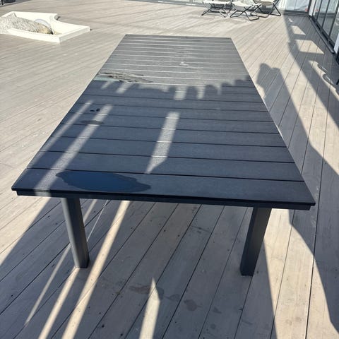 Rektangulärt matbord för utomhusbruk i svart färg. Bordsskiva med längsgående ribbor och raka ben. Passar exempelvis på altan, uteplats eller trädgård som matbord.