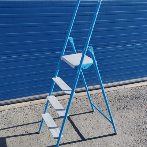 Säckakärra i metall i grå och blå färg. Hopfällbar konstruktion med utdragbart handtag och två hjul. Lastytan består av metallribbor och är avsedd för transport av kartonger, väskor eller annan last. Passar för användning vid flytt, transporter och liknande uppgifter där man behöver flytta tyngre föremål på hjul.