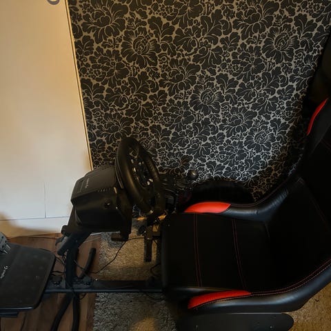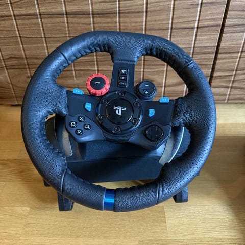 Logitech G29 racerratt med pedaler i svart. Ratten har flera funktionsknappar, vred och växlingspaddlar monterade på baksidan. Pedalenheten har tre pedaler med metallplattor för gas, broms och koppling. Utrustningen är kabelansluten och avsedd för bilspel och racingsimulatorer. Monterad på enkel ställning enligt bilderna.