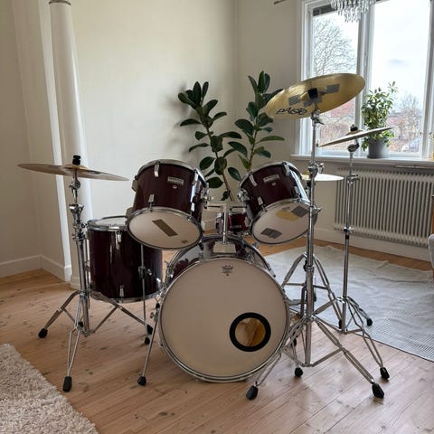 Säljer ett Tama Swingstar trumset, (Basstrumma, golvpuka, två hängpukor, high-hat crash-cymbal och virveltrumma, medföljer gör en extra virveltrumma, "cowbell" samt en liten handhållen trumma. Ett extra trumskin följer med. Crash-cymbalen bör bytas ut.