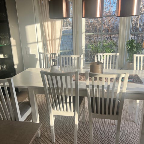 Filippa, Matbord i massiv oljad ek med fyra stolar från Svenska hem i Degerfors. Nypris ca 15000kr. Matbordet är 140x90 cm. Pris: 3000kr.