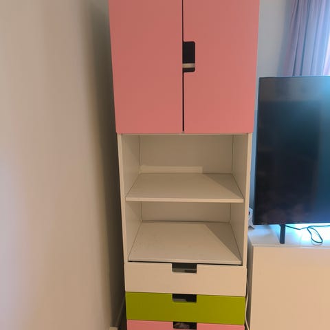IKEA garderob för barn i flerfärgad design med gröna och rosa dörrar och lådor. Skåpet har flera hyllplan och förvaringsutrymmen bakom dörrar samt lådor nedtill för extra förvaring. Passar i barnrum för förvaring av kläder, leksaker och andra tillhörigheter.